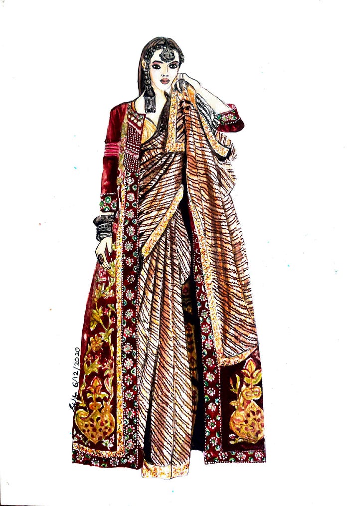 14. A striped saree paired with heavy hand embroidered velvet jacket is a blend of modern and trational fashion. Paired with heavy oxidized jewellery. Water colours, and colored gel pens are used.