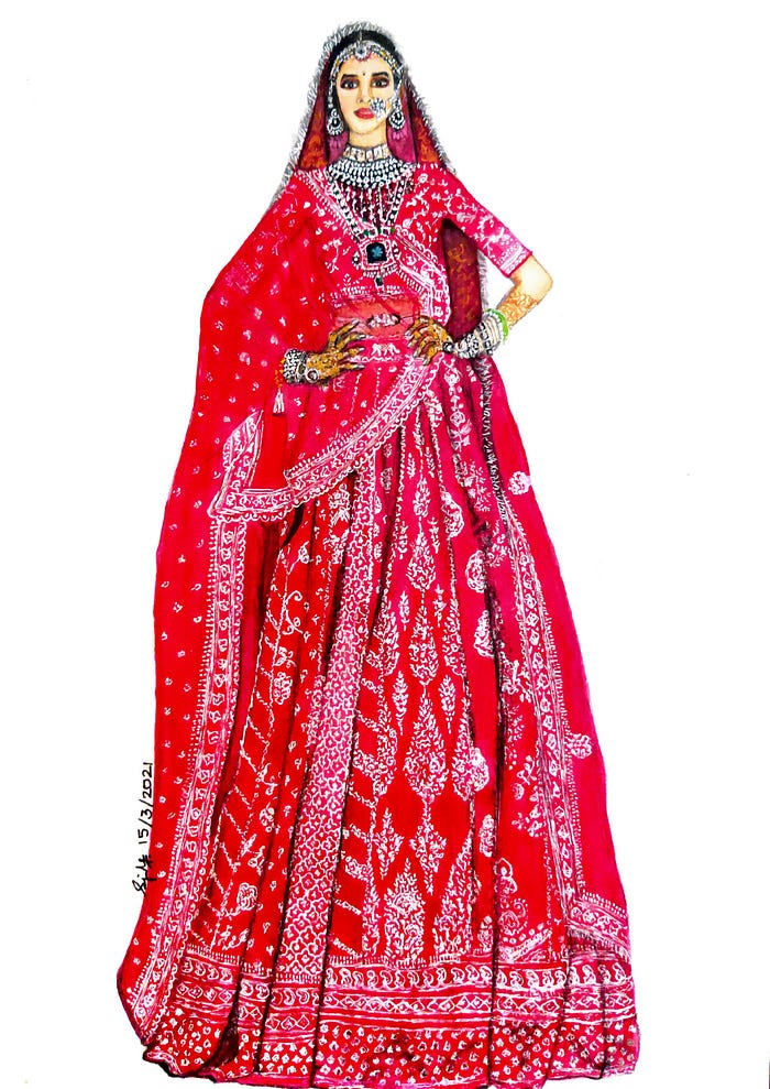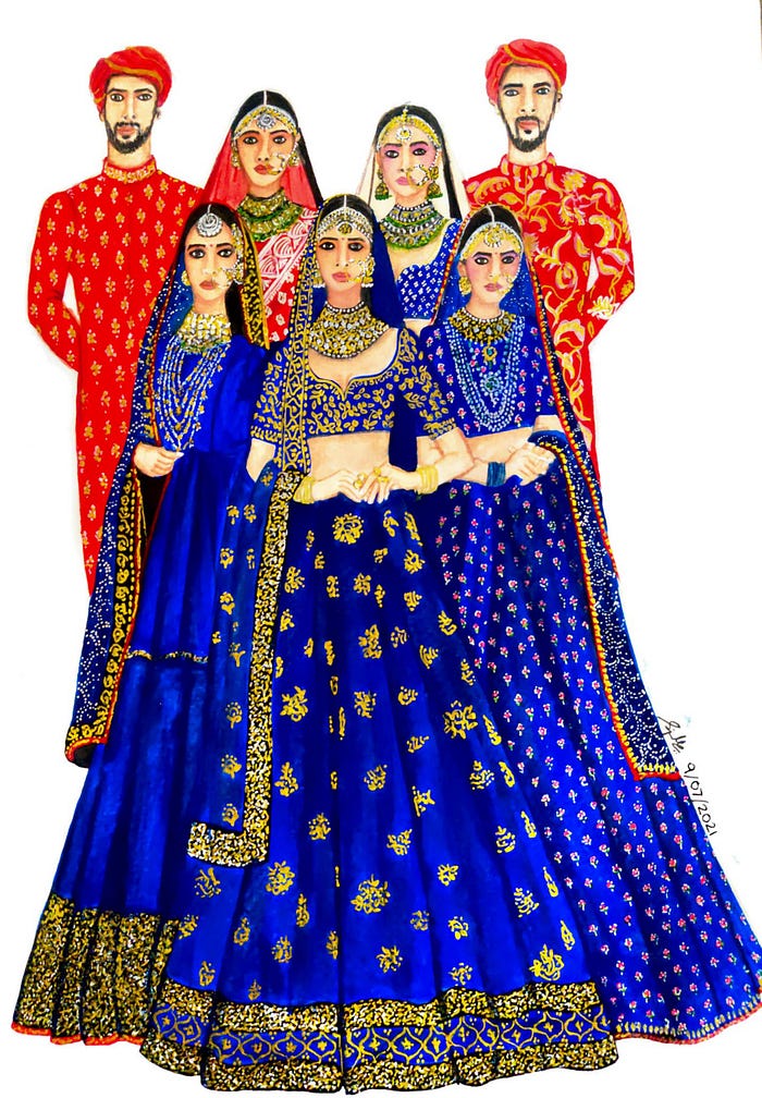 - ’The Blue Marine’ is the first set of illustrations inspired by designer Sabhyasachi Mukherjee’s works. The garments are designed using bright color pallete with beautifull intricrate work paired with heavy jewellery. The medium used are water-based colors and the embroidery is portrayed with white and golden gel pens.