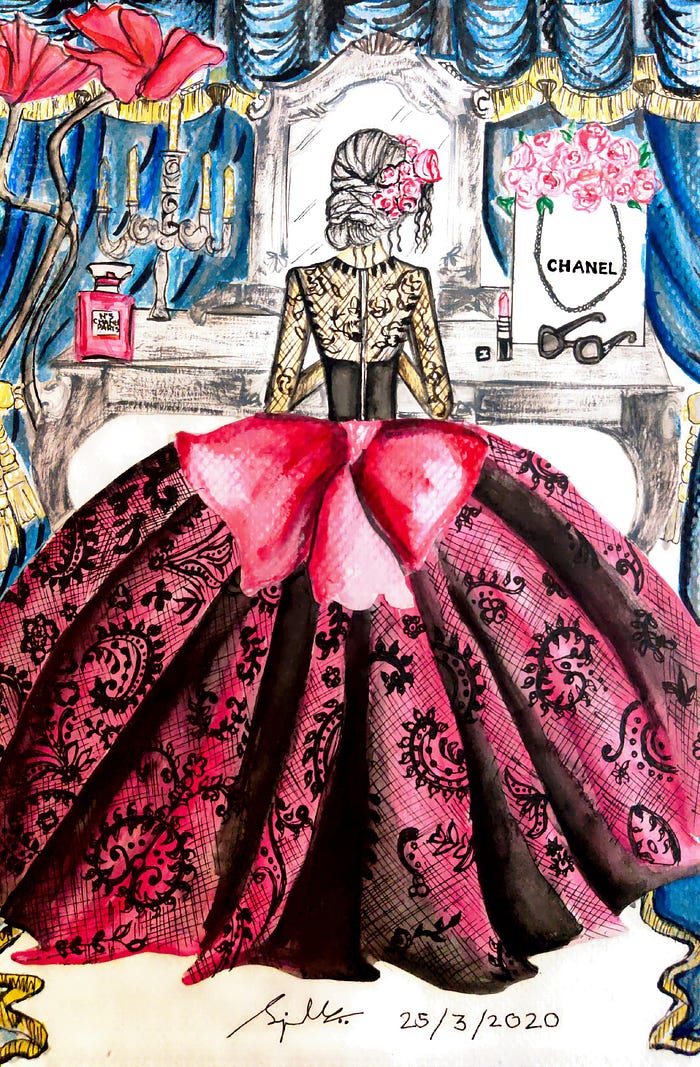 7.”The Dressing Room” this a Princess theme illustration. An eye catchy fullness gown with floral net and a big satin bow is surely high on fashion. A dressing room is choosen as the background with Channel handbag, perfume, glairs, a lipstick shade and a vintage candle stand with dark blue valance curtains all of which adds up to the beauty of this illustration. Water based colors and gel pens used.